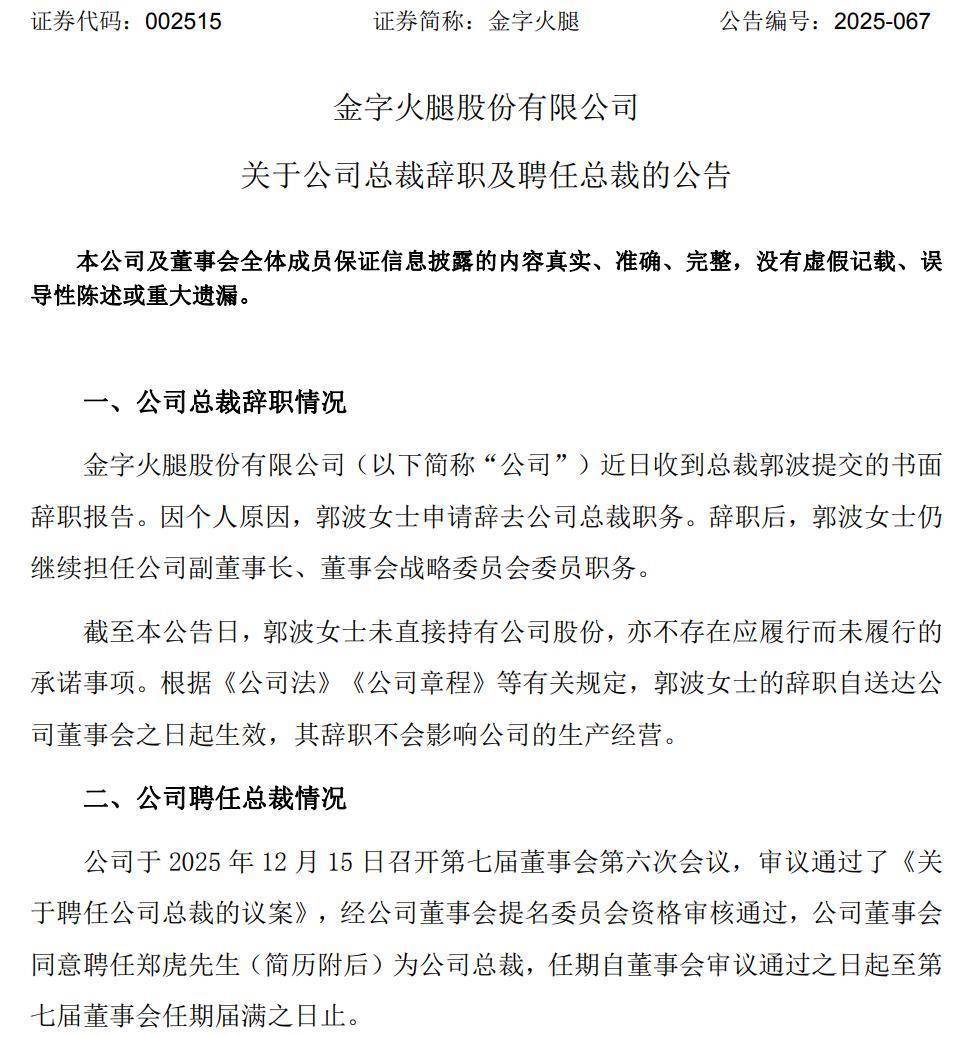 12月15日晚间,“火腿第一股”金字火腿(002515)公告,因个人原因,郭波申请辞去公司总裁职务。辞职后,郭波仍继续担任公司副董事长、董事会战略委员会委员职务。公司于2025年12月15日召开第七届董事会第六次会议,审议通过了《关于聘任公司总裁的议案》,经公司董事会提名委员会资格审核通过杠杆平台app哪个可靠,公司董事会同意聘任郑虎为公司总裁。